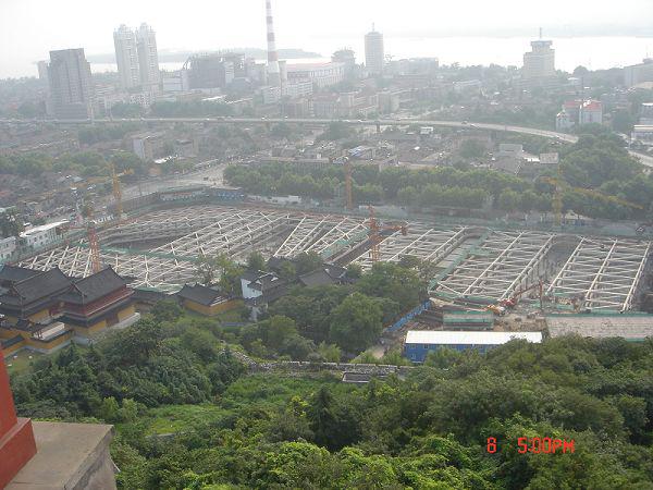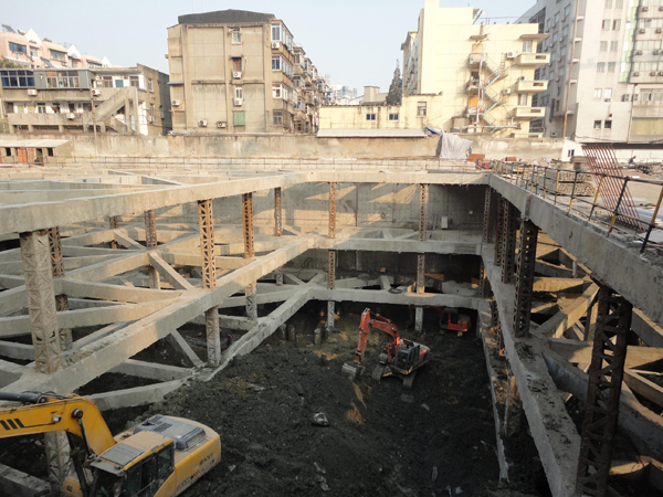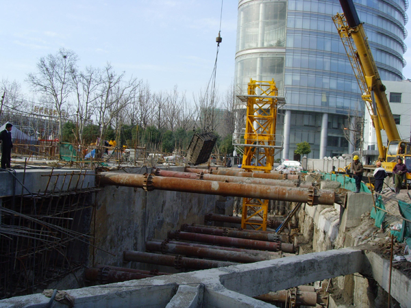 支護型式:東側僅靠靜海寺、天妃宮,采用鉆孔灌注樁加三層鋼筋砼支撐擋土,外圍采用深攪樁止水,其余區域采用SMW工法(三軸深攪樁中插型鋼)加三層鋼筋砼支撐。坑內布置適量疏干井。南北二端支撐呈角撐布置,中間采用對撐,呈桁架布置,挖土方便。為節省造價,支撐立柱樁最大限度利用工程樁。