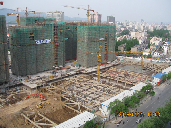 支護型式:采用鉆孔灌注樁加一層支撐擋土結構,基坑西側采用圓環支撐,東側采用對撐,圓環和對撐有機結合。圓環支撐不僅空間大,挖土方便,而且經濟。支撐材料采用鋼筋砼,具有整體性好、剛度大,而且布置靈活等優點。建設單位對設計非常滿意,同時得到了宜興建設局的表揚,取得了良好的社會效益。