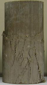 在素土中加入纖維和水泥都能起到提高強度的目的,且提高幅度基本處于同一水平(175-200%),其中素土的強度為0.16MPa,纖維土和水泥土的強度分別為0.44和0.48MPa。但素土、纖維土和水泥土的破壞特征各不相同:素土表現為應變軟化的塑性破壞;水泥土表現為完全的脆性破壞,土體強度瞬間喪失,形成的破壞裂隙寬大,相互貫通(圖2(a));纖維土則表現為應變硬化的塑性破壞,破壞后土樣中發育的裂隙相對比較細小,呈現裂而不斷的特征(圖2(b)),這對工程結構的穩定性有重要意義。此外,當在纖維土中再加入水泥后,強度得到成倍增加,達到1.18MPa,遠遠超過單純的纖維土和水泥土強度之和,說明二者配合使用增強效果更佳,能極大減少材料用量,節約工程成本。