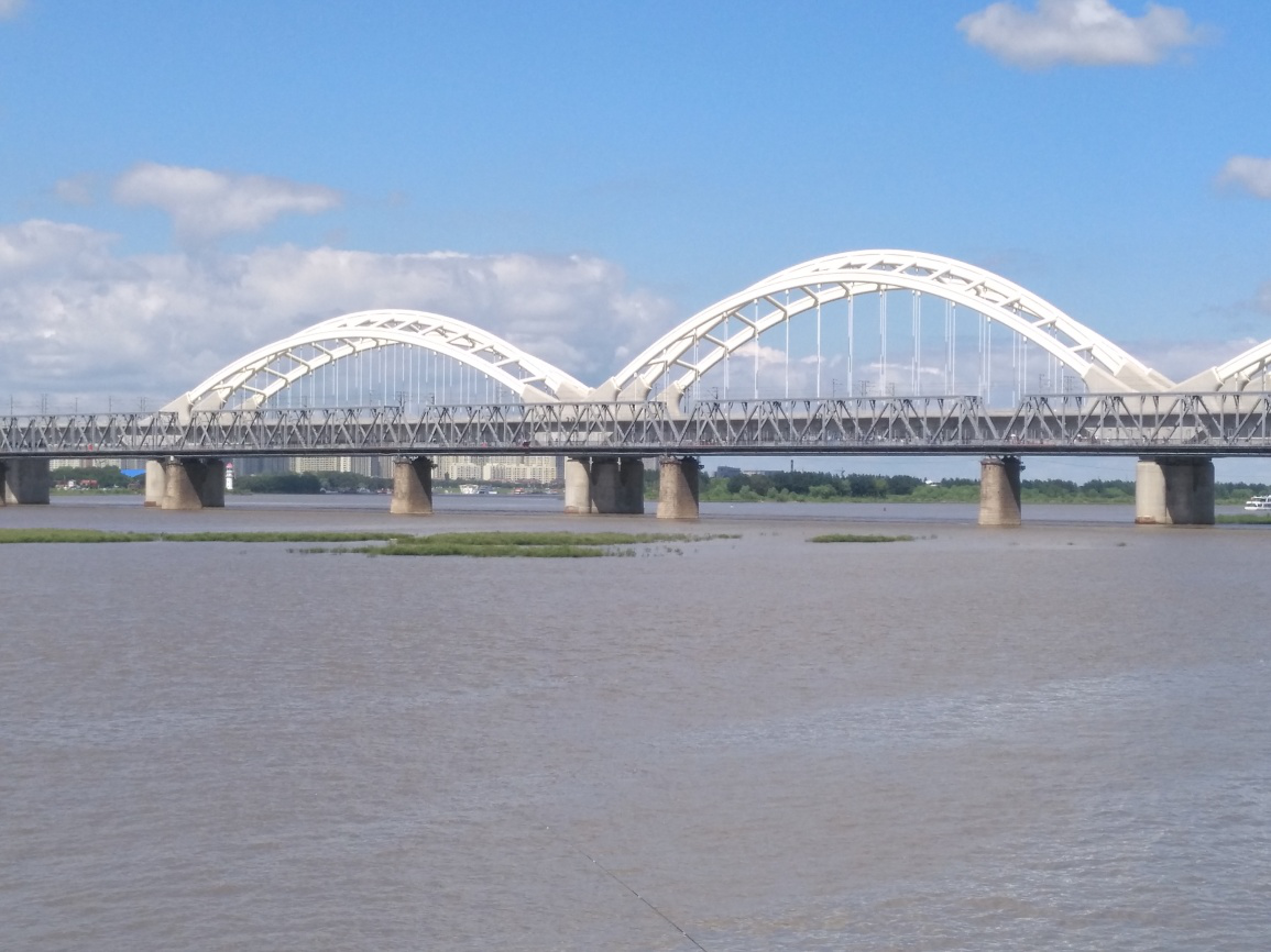 都說早起的鳥兒有蟲吃,早起果然看到不一樣的風景。昨天晚上去的是界河廣場的右邊,今晨往左邊走,下面有一個長長的木棧道。穿過木棧道,再向界河挺進一些,竟然看到我們鮮艷的五星紅旗了,給我們莊嚴的國旗來一個特寫吧。你還想越過鐵絲網再往前走一點嗎?不行了,這里已經是隔離帶了,越過鐵絲網過去就是“老毛子”——俄羅斯人的地盤了。