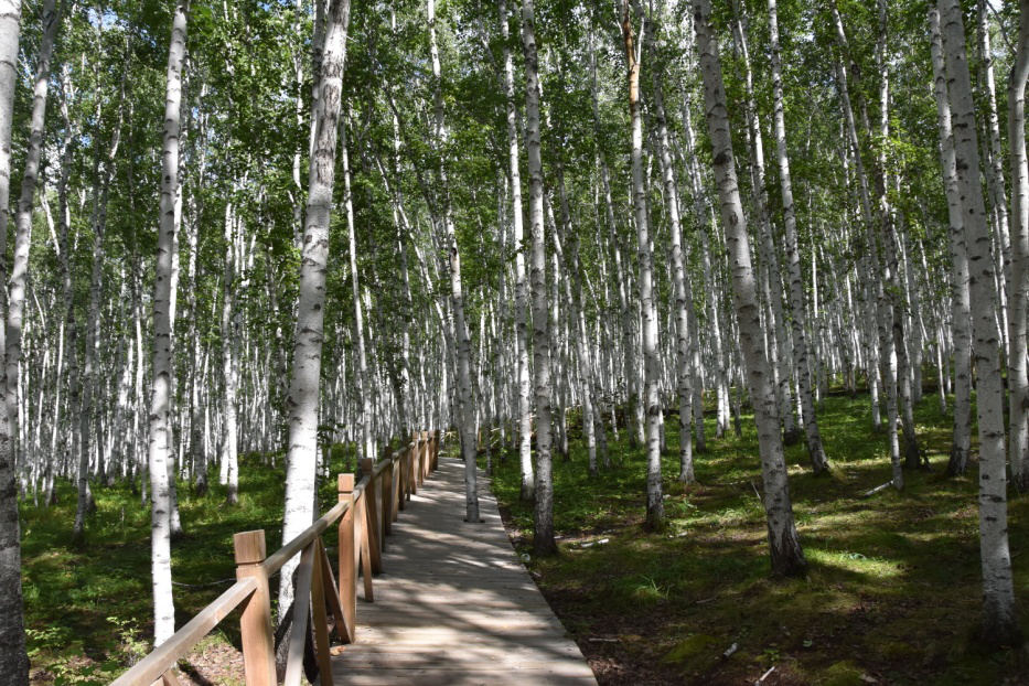 成片的白樺林,斑駁的白樹皮。有人說,樹皮上一塊一塊的黑圈是美麗的姑娘的眼睛,她在眺望著遠方,期盼著戰場上的愛人能早日歸來。美麗的傳說,讓人想起樸樹那首膾灸人口的歌:《白樺樹》。