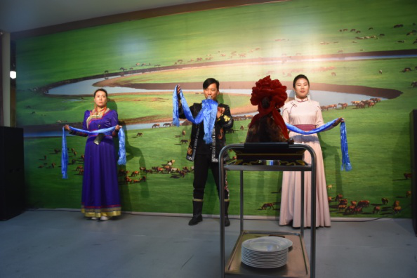 被隊友坑了一把,愣是穿了一回生平從未穿過的怪異民族服裝。我上臺在羊背上劃了一個十字刀,說是寓意著十全十美;又用無名指沾了酒杯中的酒向上彈一下,再向下彈一下;祭完天后,將酒一飲而盡。儀式結束,可以開始吃嘍!